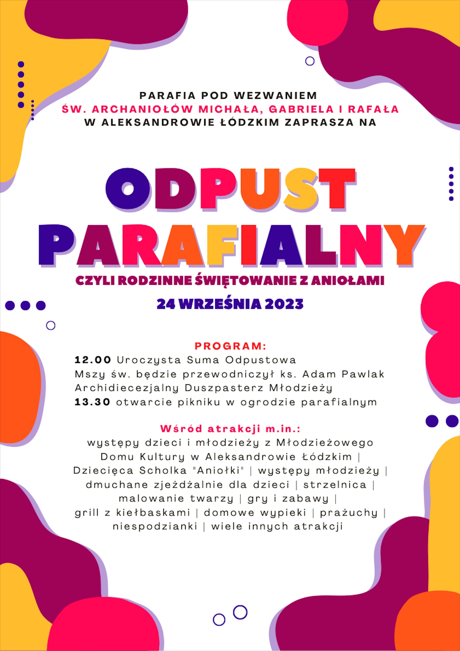 Odpust Parafialny 17/09/2023 Ogłoszenia Nawigacja wpisu Poprzedni Poprzedni wpis: Intencje mszalne: 18. 09. 2023 r. – 24. 09. 2023 r.Następny Następny wpis: Uroczystość św. Archaniołów Michała, Gabriela i Rafała 24 września 2023 r.