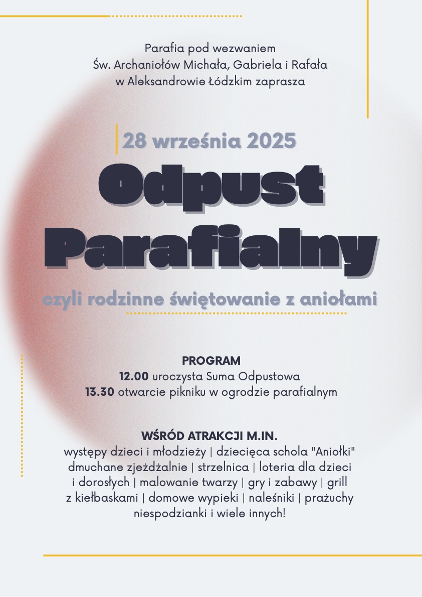 Odpusy parafialny 19/09/2025 Ogłoszenia Nawigacja wpisu Poprzedni Poprzedni wpis: Pielgrzymka rowerowa „Śladami Św. Siostry Faustyny”.Następny Następny wpis: Intencje mszalne: 22. 09. 2025 r. – 28. 09. 2025 r.
