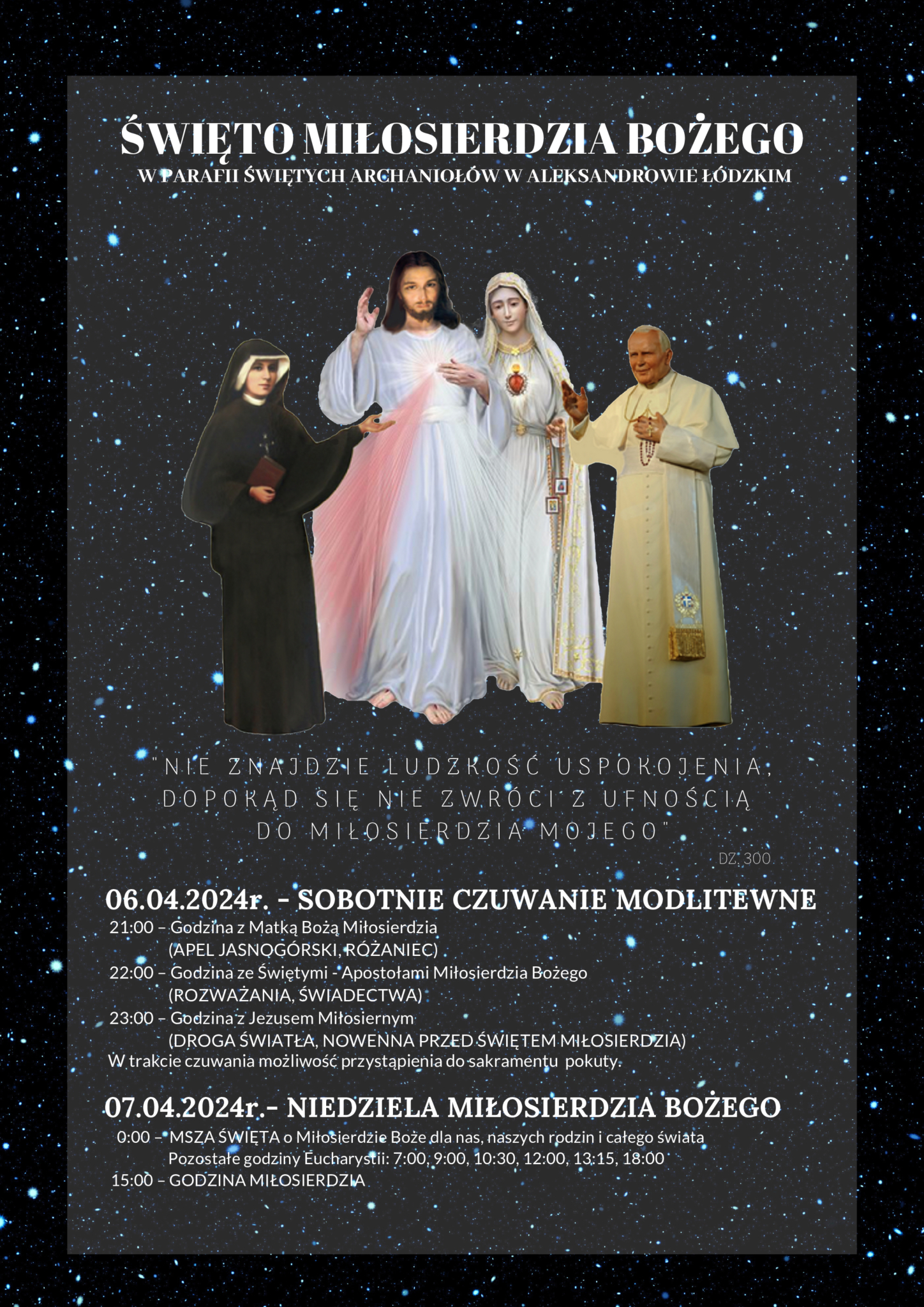 CZUWANIE PRZED NIEDZIELĄ MIŁOSIERDZIA BOŻEGOSOBOTA – 06.04.2024 r. 21:00 – Godzina z Matką Bożą Miłosierdzia (Apel Jasnogórski i Modlitwa Różańcowa) 22:00 – Godzina ze Świętymi -Apostołami Miłosierdzia Bożego (Rozważania i Świadectwa) 23:00 – Godzina z Jezusem Miłosiernym (Droga Światła). W trakcie czuwania możliwość przystąpienia do sakramentu pokuty. Dla chętnych przewidziana gorąca kawa i herbata.