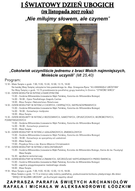I ŚWIATOWY DZIEŃ UBOGICH 12/11/2017 Caritas parafialny Nawigacja wpisu Poprzedni Poprzedni wpis: Orędzie Ojca Świętego Franciszka na I Światowy Dzień UbogichNastępny Następny wpis: Intencje mszalne 20. 11. – 26. 11. 2017 r.